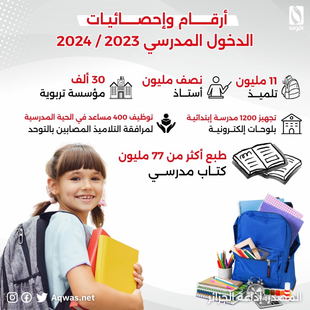 إلتحق 11 مليون تلميذ بمقاعد دراستهم لبداية الموسم المدرسي 2023/2024 بمختلف ولايات الوطن حيث قدر عدد تلاميذ ولاية ادرار ب86 الف تلميذا يؤطرهم 5033 أستاذا في 301 مؤسسة تربوية , حيث عرف قطاع التربية لهذا العام تركيزه على إدماج الرقمنة في مختلف التعاملات كالتسجيل في ملفات التعاقد للأساتذة وكذا تسهيل عمليات تنقلات الأساتذة نحو أماكن التدريس المناسبة للمناطق تواجدهم و كذا توفير اللوحات الرقمية للمدارس وإمكانية تسجيل الأولياء لتلاميذ السنة الأولى الابتدائي المولودين في 2018 , كما تم العمل على توسيع استخدام اللوحات الرقمية لأكثر من 1200 مؤسسة إبتدائية , وطبع أكثر من 77 مليون كتاب مدرسي تم توزيعها قبيل الدخول المدرسي باسبوع