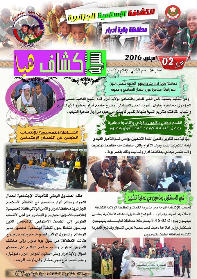 أصدر محافظة الكشافة الإسلامية الجزائرية بأدرار نشرية شهرية في عددها الثاني ، جمعت كل النشاطات الكشفية التي أقيمت، وهي موجهة للكشافين و للأفراد الغير منتسبين للكشافة بهدف إعلامهم بماهية و مضمون الكشافة و الأنشطة التي تقدمها الحركة الكشفية لصالح الفتية و الشباب. النشرية عبارة عن صفحتين فيها أخبار سريعة و مصحوبة بصور تضع القارئ في صورة الحركة الكشفية بأدرار.