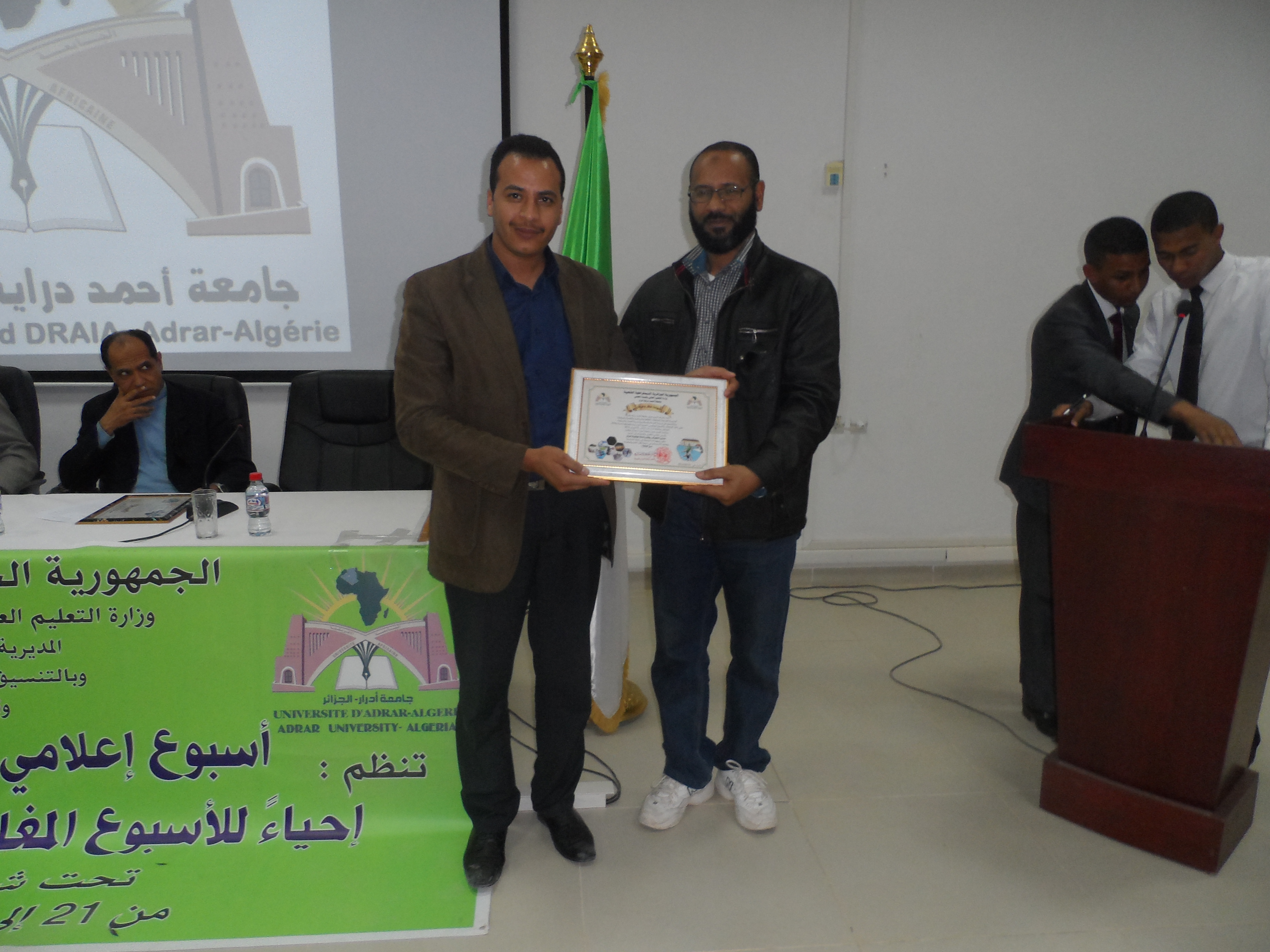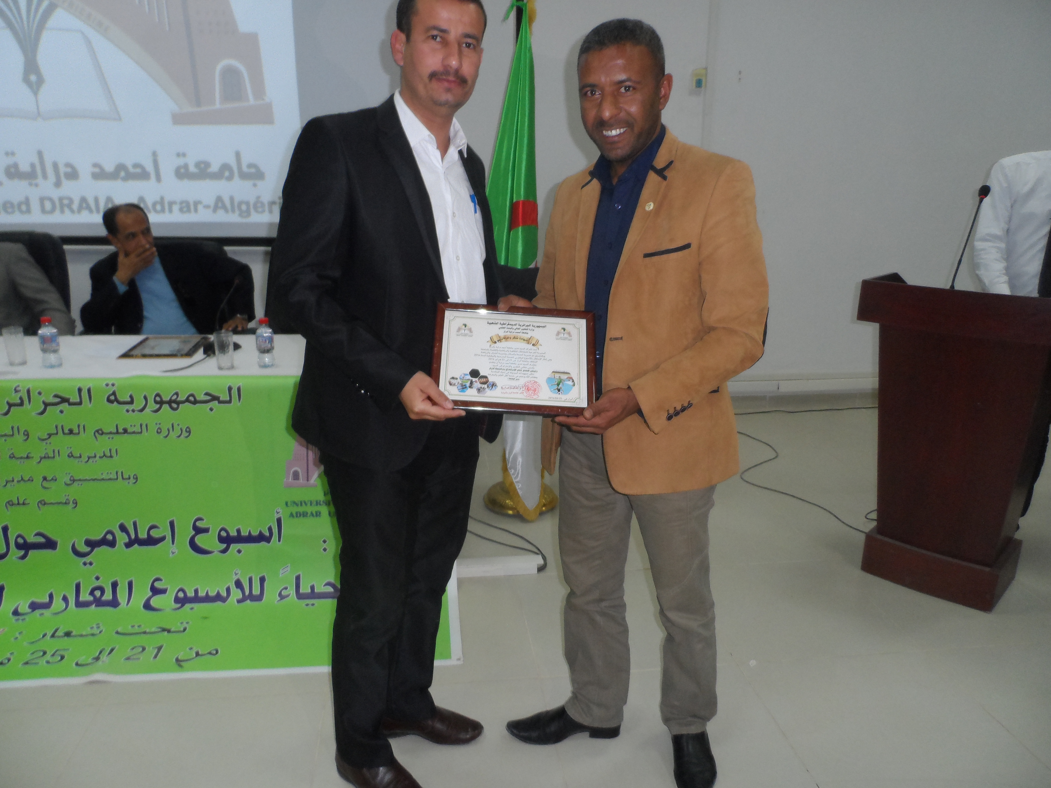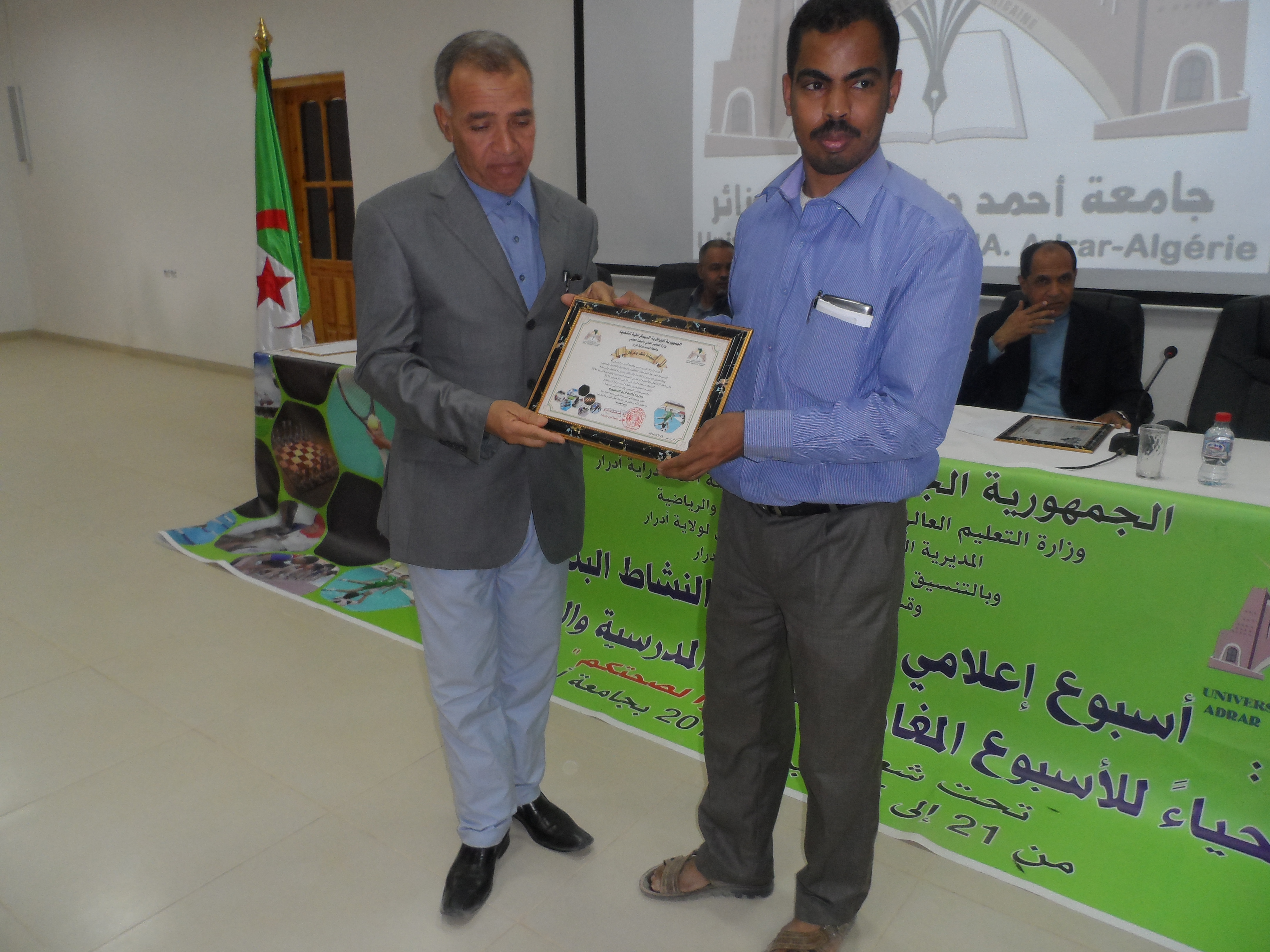 اختتم الأسبوع المغاربي للصحة البدنية بجامعة أدرار الذي تم تنظيمه بالتنسيق مع مديرية الشباب والرياضة و مديرية الصحة و الإسكان مديرية الخدمات الجامعية، عرفت التظاهرة مشاركة إيجابية للطلبة حيث أقيمت منافسات في كل من الشطرنج ب 32 مشارك، سباق السرعة بـ13 مشارك و كرة اليد يأربع فرق مشاركة. و على هامش المنافسات الرياضية نظمت حملة للتبرع بالدم أشرفت عليها مديرية الصحة بالإضافة إلى تسطير ندوات حول أهمية الرياضة في الوسط الجامعي ، وقد أثنى المشاركون في هذه التظاهرة على هذه المبادرة آملين أن تستمر و تجد صدى أوسع لدى الطلبة. كما تم تكريم كل المشاركين في المنافسات من طلبة و لجنة تحكيم و مؤطرين مشرفين على نجاح هذه التظاهرة.